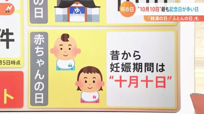 まずは「銭湯の日」です。銭湯を数字にすると1010でセントウの語呂合せ。そして「赤ちゃんの日」こちらは妊娠期間が“十月十日”に由来して制定されました。