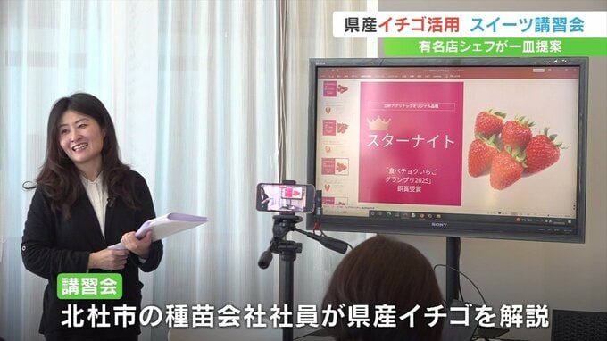 テーマはイチゴで、山梨県北杜市の種苗会社の社員が県産のイチゴについて、ほどよい酸味や硬さがあって加工しやすいなどとスイーツとして活用しやすいことを解説しました。