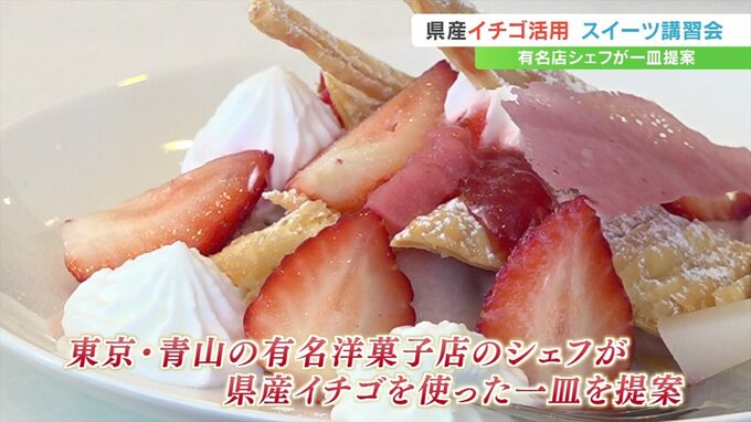 また東京・青山の有名洋菓子店のシェフがミルフィーユやスポンジケーキに県産イチゴを使った一皿を提案し、参加者は熱心にメモをとりながら解説に聞き入っていました。