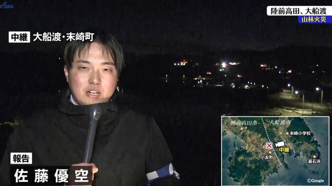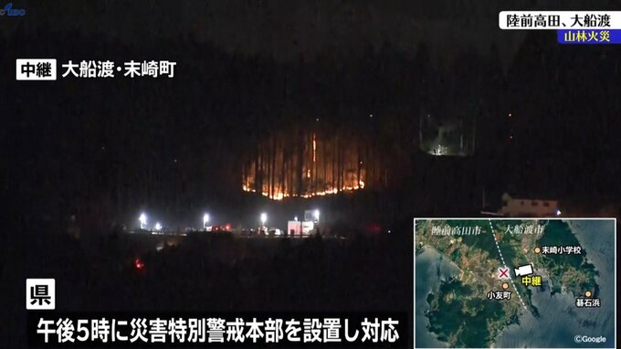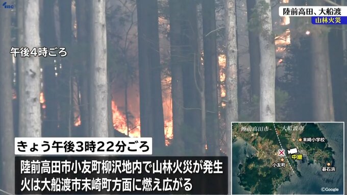 25日午後、岩手県陸前高田市小友町で山林火災が発生し、大船渡市末崎町方面に現在も延焼しています。現在近くの地域に避難指示が出ています。