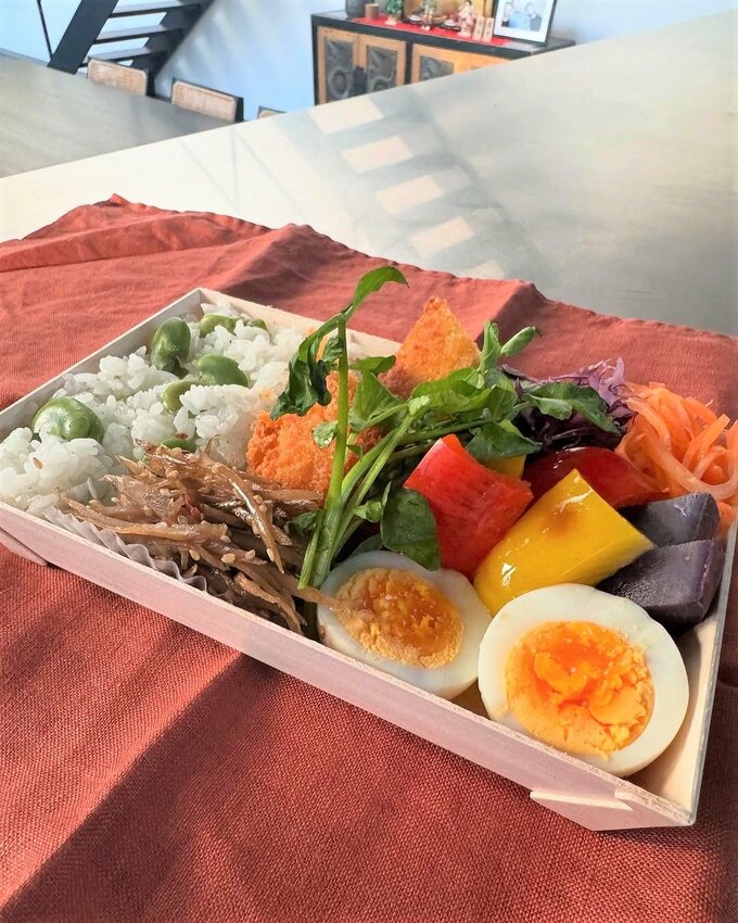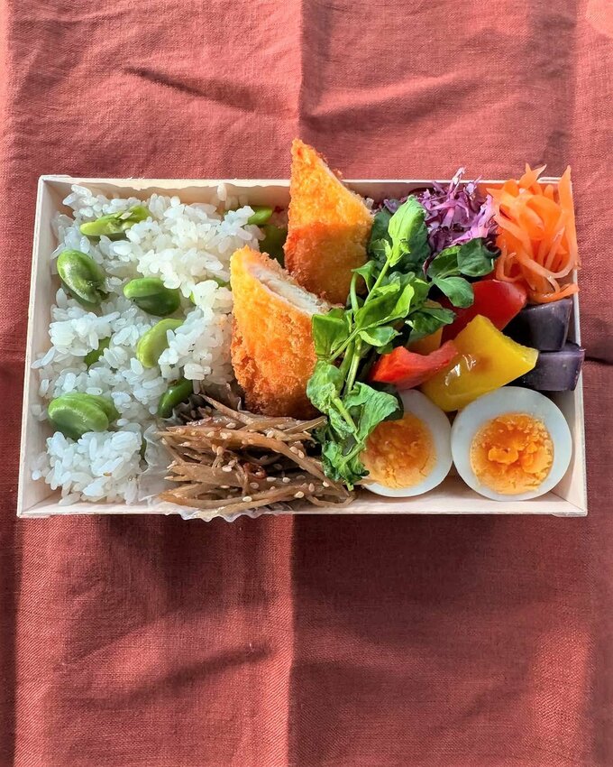 投稿された写真では、ゆでたまご、きんぴらごぼう、パプリカ、にんじん、紫キャベツ、クレソン、フライ、そら豆ご飯など、色とりどりで美味しそうなお弁当の様子が見て取れます。