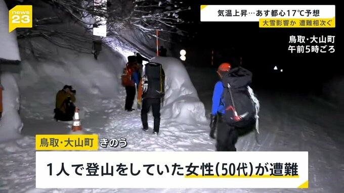 また、鳥取県大山町では24日、1人で登山をしていた50代の女性が滑落し遭難。25日朝、女性は救助されましたが、病院で死亡が確認されたということです。