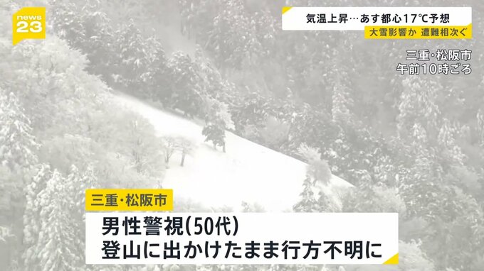 三重県松阪市では、50代の男性警視が登山に出かけたまま行方がわからなくなっています。妻によると男性警視は、24日に1人で登山に出かけたということで、警察や消防は、男性警視が遭難したとみて捜索しています。