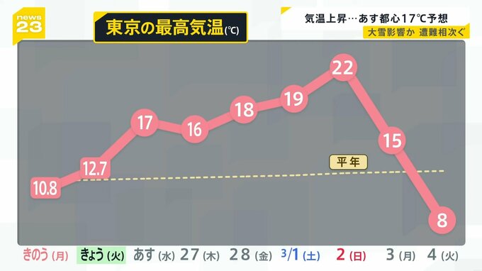 東京都心の25日の最高気温は12.7度。26日は17度にまで上がる見込みで、今年1番の暖かさとなりそうです。都心では週末にかけて、さらに気温が上昇。日曜日には最高気温が22度となる見込みで、GW並みの暖かさとなりそうです。ただ、週明けには、再び厳しい寒さとなる見込みです。