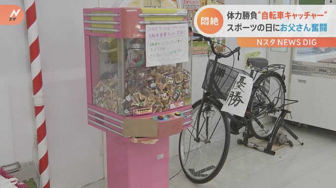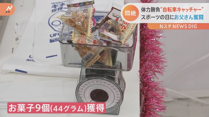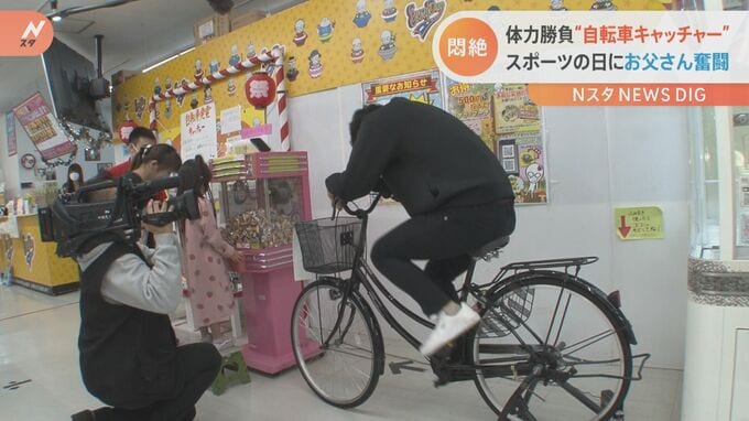 ■体力勝負“自転車キャッチャー” スポーツの日にお父さんが奮闘