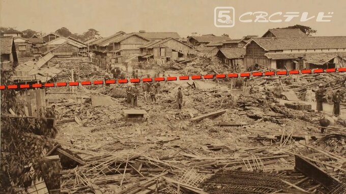 当時の一般住宅はほぼすべて木造。名古屋市内で倒壊したのは、約1250棟にのぼります。木造の建物の被害を伝える写真は熱田神宮の参道近くで撮影されました。
