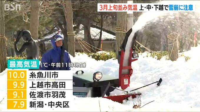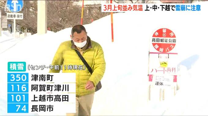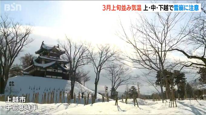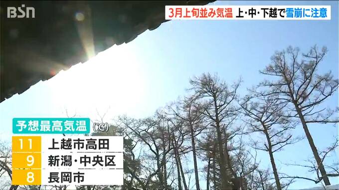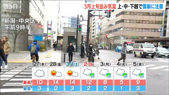 新潟県内は26日、各地で気温が上がり、すでに3月上旬並みとなっているところもあります。27日から週末にかけては最高気温10℃以上と予想されていて、上・中・下越では雪崩に注意が必要です。