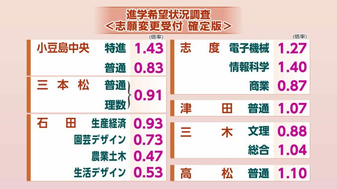 小豆島中央(特進コース)で1.43倍、志度(情報科学)で1.40倍と高い倍率となっています。