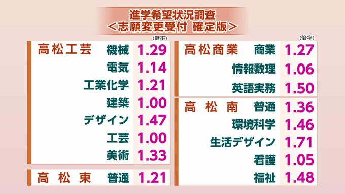 【香川県公立高校入試 2025】「一般選抜(志願変更後・確定版)」倍率 高松南(生活デザイン)1.71倍 高松商業(英語実務)1.50倍 高松1.10倍【全校・全学科掲載・2025年2月26日発表】 RSK山陽放送 2025年2月26日(水) 15:57 国内 高松工芸・高松東・高松商業・高松南 高松南(生活デザイン)では1.71倍、高松商業(英語実務)では1.50倍と高い倍率となっています。 そのほかの高校・学科は【画像②】の通りです。 【画像②】