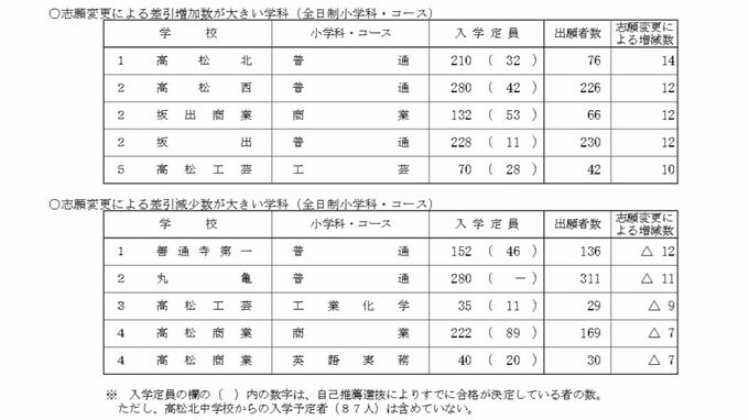 このうち、最も増加数が大きかったのは、高松北の普通科で、最も減少数が大きかったのは善通寺第一の普通科でした。