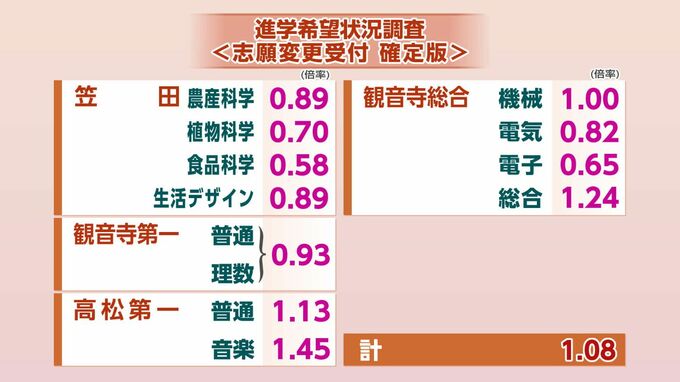 高松第一(音楽)では1.45倍、観音寺総合(総合)では1.24倍と高い倍率となっています。