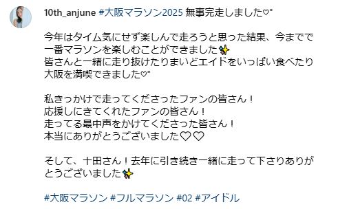 NMB48のメンバー・眞鍋杏樹さんがインスタグラムを更新。大阪マラソン2025に参加し、完走したことを報告しました。