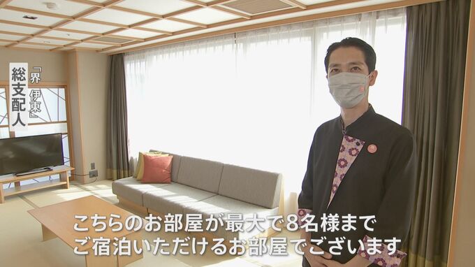 「こちらのお部屋が最大で8名様までご宿泊いただけるお部屋でございます。おひとり様5000円割引になりますので(8名だと)全部で4万円宿泊費から割引される」