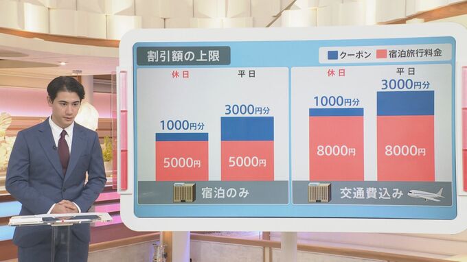 割引の上限額は、宿泊のみの場合は5000円。交通費込みの商品は8000円。これに加えて、旅行先で使えるクーポンが休日なら1000円分、平日ですと3000円分付与されるので、最大で1人1泊1万1000円補助されることになります。
