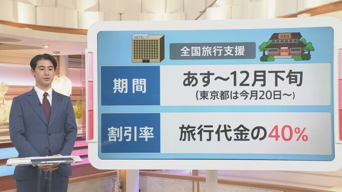 まず制度の中身を整理します。11日から始まる全国旅行支援ですが、対象は東京都を除く46道府県です。東京への旅行の適用は、20日開始となります。割引率は、宿泊旅行代金の40%までとなっています。
