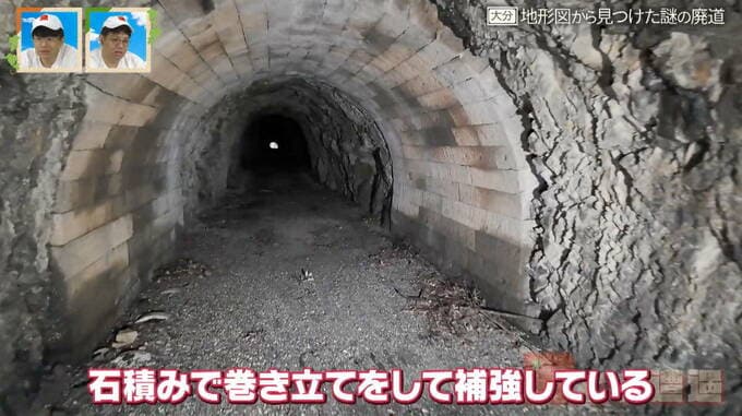 廃道区間には、明治43年(1910年)竣工の「浦代隧道」が存在。かつてはバスも走行していたそうで、隧道内は天井が高く、部分的に石積みで補強されています。