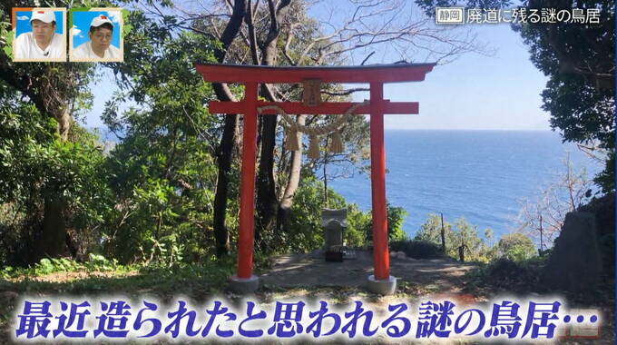 「黒根隧道」と「城東隧道」の間には、廃道になって46年経つ場所にも関わらず赤い鳥居が存在。比較的新しく、鳥居には「ハサミ石神社」と書かれています。また海岸沿いには、数十万年前の溶岩流が固まり、波の浸食を受けて形成されたという2つの大きな「はさみ石」がそびえ立っています。