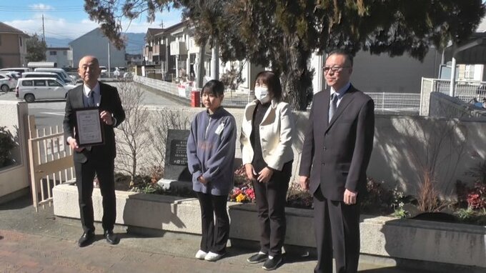 甲府市の建設会社が市内の小学校に災害の際、被害を減らす効果がある樹木「防災樹」を贈りました。