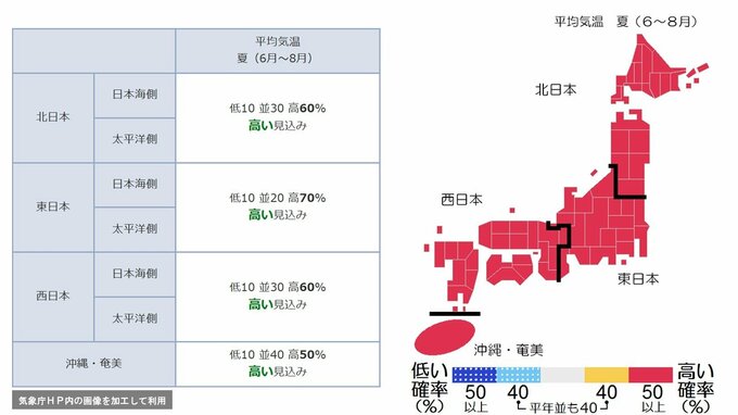 北日本(日本海側・太平洋側)では高い確率が60%、東日本(日本海側・太平洋側)では高い確率が70%、西日本(日本海側・太平洋側)では高い確率が60%となっていて、沖縄・奄美では高い確率が50%と見込まれています。