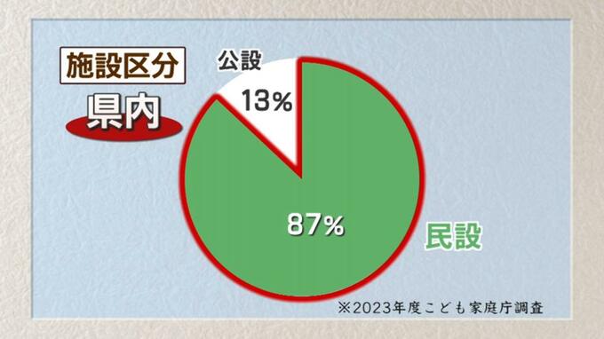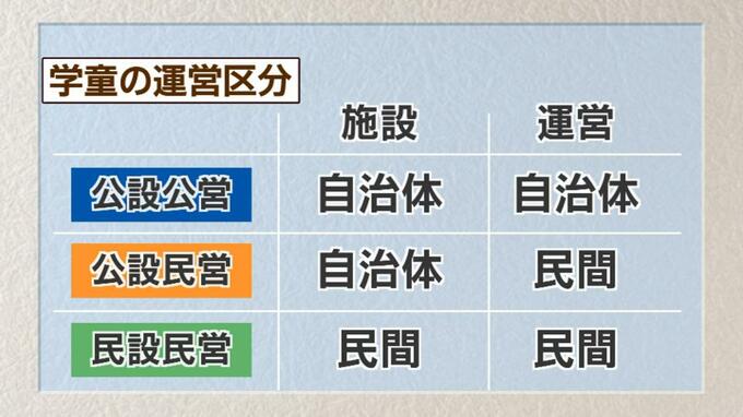 学童には3つの運営区分があります。施設の手配と運営をどちらも自治体が担う「公設公営」、施設は自治体、運営は民間の「公設民営」。どちらも民間で行う「民設民営」。民設の学童は家賃などがかかるため、運営者の負担が大きくなります。全国は3割程度なのに対して、沖縄は約9割。