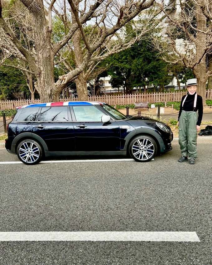 テリーさんは「休日に愛車CLUBMAN で神宮外苑に来ました」とテキスト。その愛車は「MINI CLUBMAN」。2001年からBMWがMINIブランドを扱うことになって以来愛されてきた車種とのことで、テリーさんの一台についてはルーフ全面が大英帝国旗(ユニオンジャック)のマークで染められているユニークな仕様。一方、ボディは漆黒で、冬の曇り空の下で渋く艶めいています。