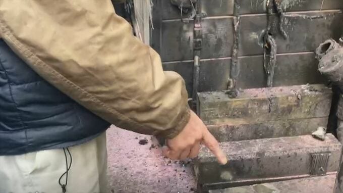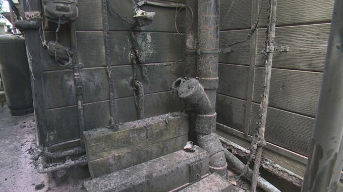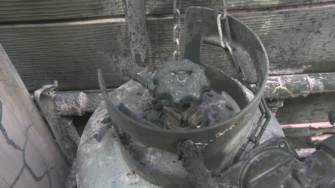 「火の手が上がったのは、建物と建物の間の人1人がギリギリ通れる狭さの場所で、見てみますとガスボンベの周りが黒く焦げています」