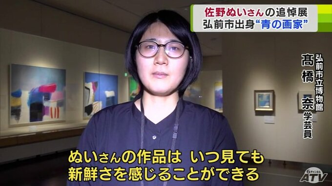 弘前市立博物館で開かれている追悼展では、36点が展示され、“ぬいブルー”と呼ばれる青を基調にした大胆な構図や配色を楽しむことができます。