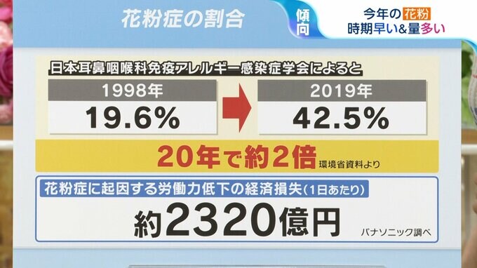 日本耳鼻咽喉科免疫アレルギー感染症学会によると、1998年には19.6%でしたが、2019年は42.5%。環境省資料では、20年で約2倍というデータもあります。