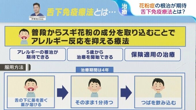舌下免疫療法は、普段からスギ花粉の成分を取り込むことでアレルギー反応を抑える療法です。