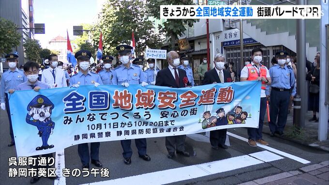 10月11日から始まる全国地域安全運動に先立ち、警察などは10日、静岡県静岡市で街頭パレードを行いました。街頭パレードには警察の関係者や防犯ボランティアなど約60人が参加し、啓発チラシなどを配りながら歩きま…