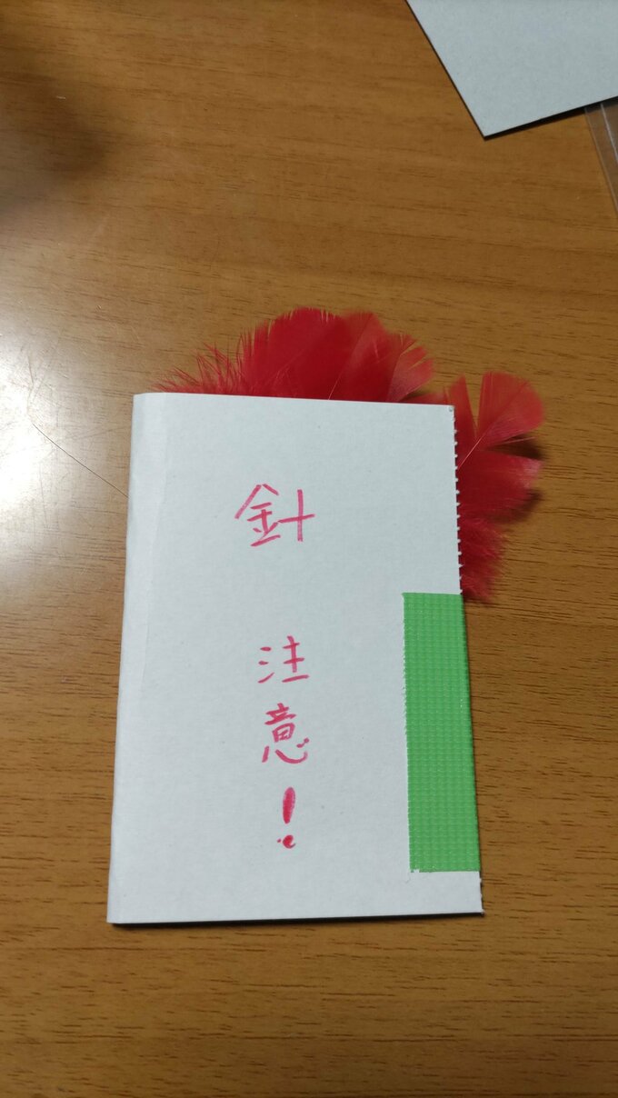 投稿された画像では、尖ったもの(赤い羽根や、ピン)などの先端を、様々な方法でカバーしている様子が見て取れます。
