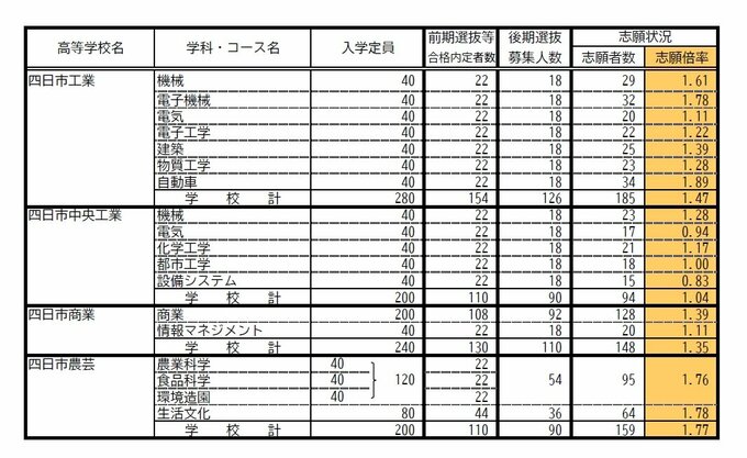三重県立高校入試2025 後期選抜の志願倍率・出願状況 普通科は桑名1.03倍、四日市0.74倍、津1.13倍、伊勢0.87倍