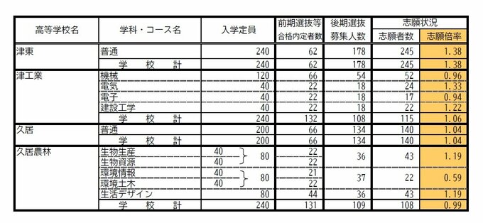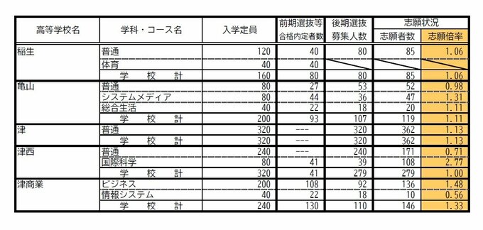 三重県立高校入試2025 後期選抜の志願倍率・出願状況 普通科は桑名1.03倍、四日市0.74倍、津1.13倍、伊勢0.87倍