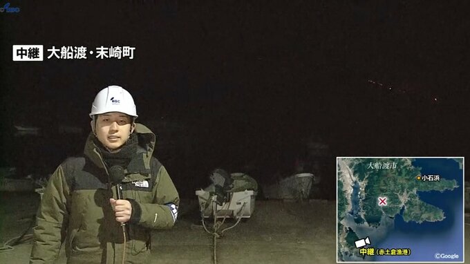 中継している場所と火災現場は大船渡湾を隔てているため、においや煙は感じられません。