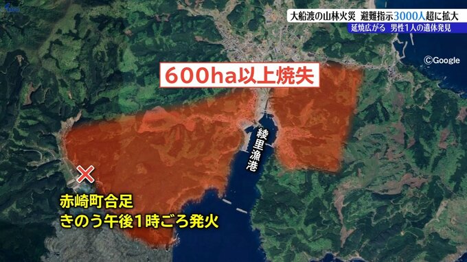 火は乾燥した空気と西寄りの強風の影響で合足地域から北東へ短時間で燃え広がり、大船渡市によりますと26日午後5時時点で600ヘクタール以上が焼けました。