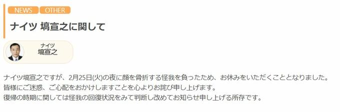 公式サイトでは「ナイツ塙宣之ですが、2月25日(火)の夜に顔を骨折する怪我を負ったため、お休みをいただくこととなりました。」と報告しました。
