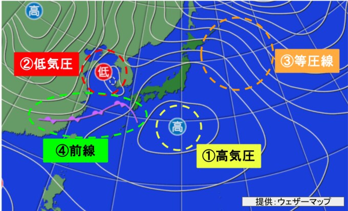 こちらは地上の気象状態を示す「地上天気図」です。見るべき基本は次の4つです。