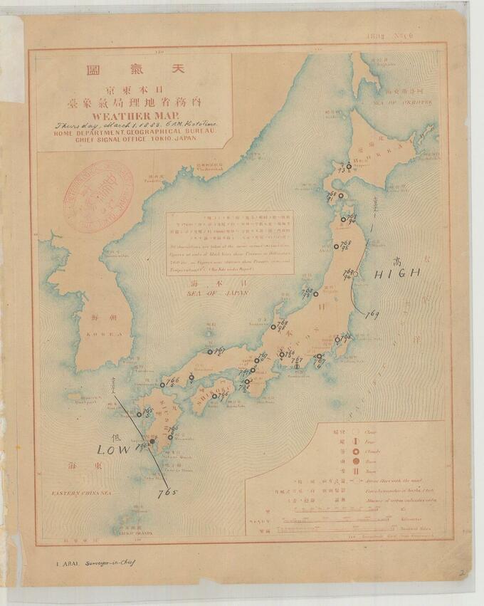 天気図が作られるようになって約3か月後の1883年5月26日には初の暴風警報が発表されました。