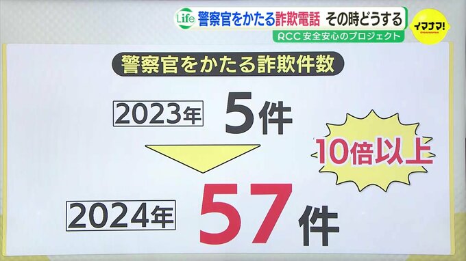 2023年の警察をかたった詐欺の被害は5件であったのに対して、2024年は10倍以上の57件も詐欺が起きています。