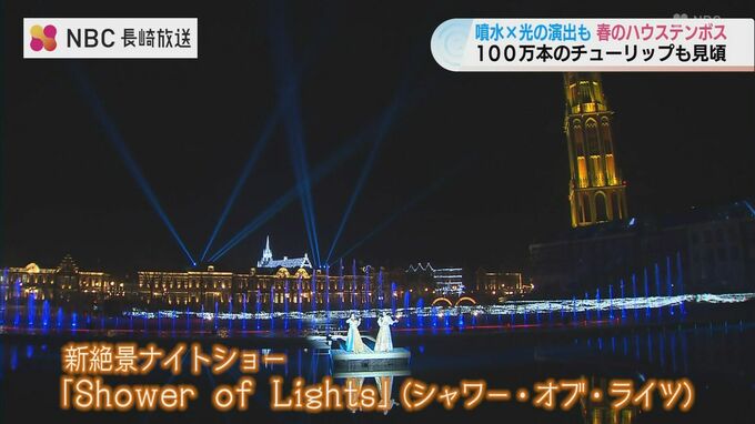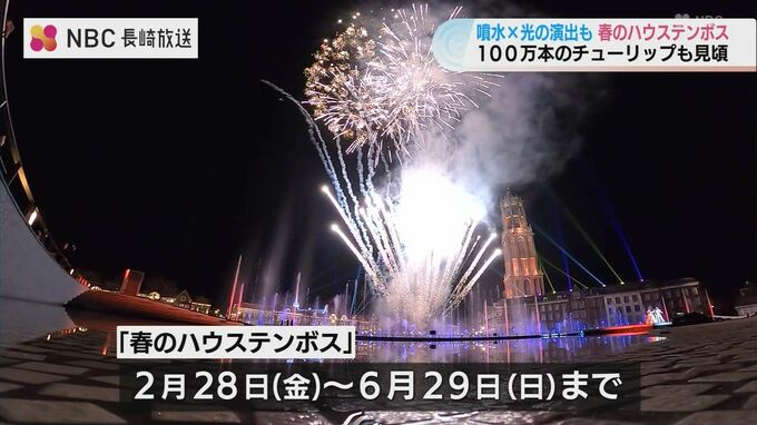 絶景は夜も続きます。噴水とサーチライトがシンクロしたここだけのナイトショー。最後を締めくくるのは至近距離の花火です。光の演出で圧倒します。「春のハウステンボス」は28日金曜日から6月29日までです。