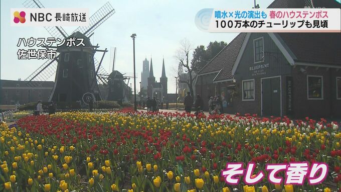 百万本のチューリップが咲きそろっています。この時期は景色と色彩に加えて、香りも満喫できる空間です。明日から始まる「春のハウステンボス」。キーワードは絶景のエンターテインメントです。新たに設けられた「花絶景エリア」では期間限定の特別なミッフィーパレードとメイポールダンスが行われます。