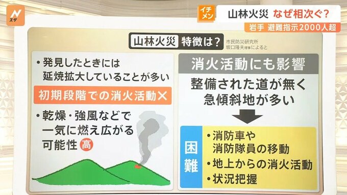 山林火災というのは、消火活動が難しいといわれています。坂口さんによれば、次のような特徴があるということです。