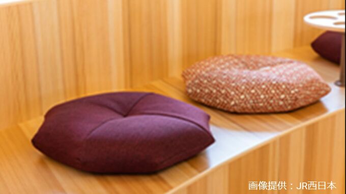 さらに全車に配置されているのは、「京織物おじゃみ座布団」【画像⑩】。京都の職人さんが、はなあかり専用に様々な座布団を作ったのだそうです・ちなみに「おじゃみ」とは「お手玉」のこと...遊び心が満載です。