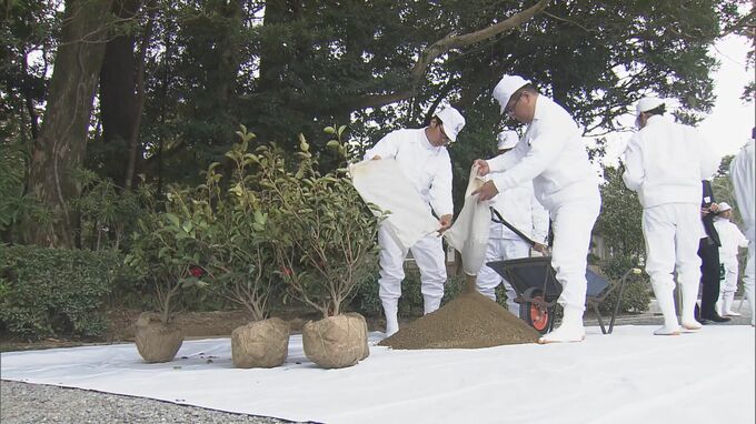 きょうは、造園業者らが高さ約50センチの「寒椿」の苗木をかごに乗せて担ぎ、宇治橋を渡って「五丈殿」へ向かいました。
