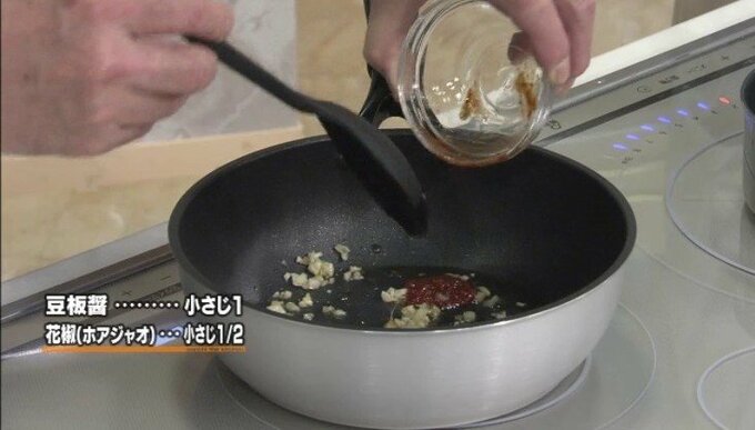 3.香りが立ったら豆板醤と花椒を加え軽く炒める。