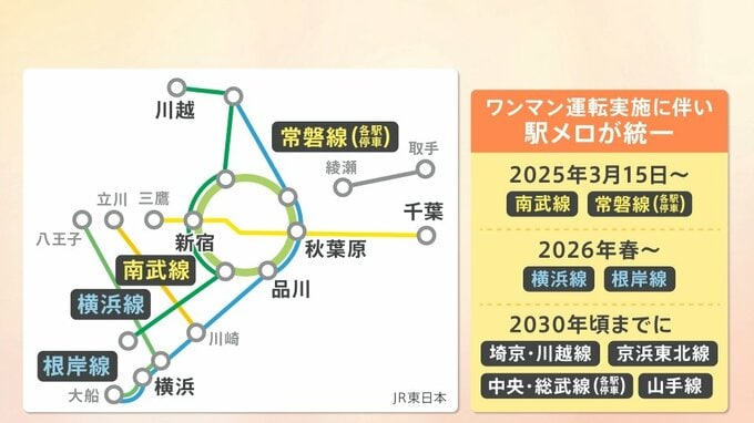 ワンマン運転実施に伴い、3月15日から南武線・常磐線(各駅停車)で駅メロが統一されます。