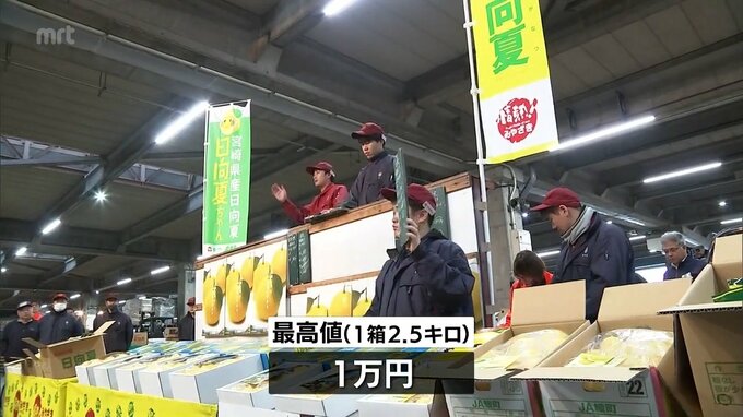 宮崎県のブランド果樹「日向夏」の露地ものの販売が、1日解禁され宮崎市で初競りが行われました。ハウスものに比べ白い皮が厚く甘みが強い露地ものの日向夏。競りでは、宮崎市や綾町で生産された露地ものの日向夏4…