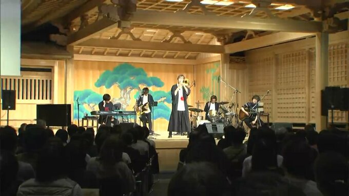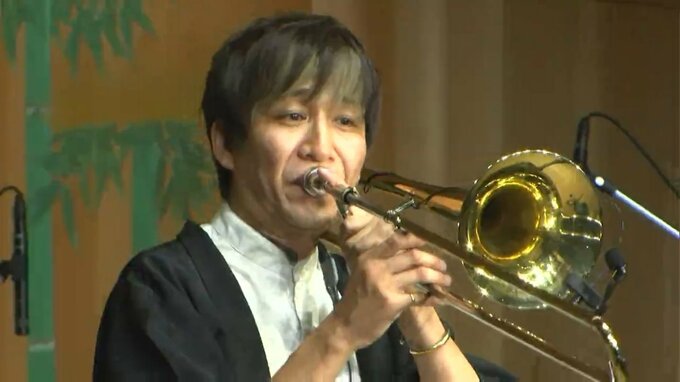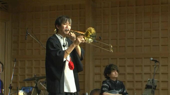 能楽の舞台にあわせた羽織姿でトロンボーンを演奏するのは、瀬戸内市出身で「せとうちPR大使」も務める馬場桜佑さん。