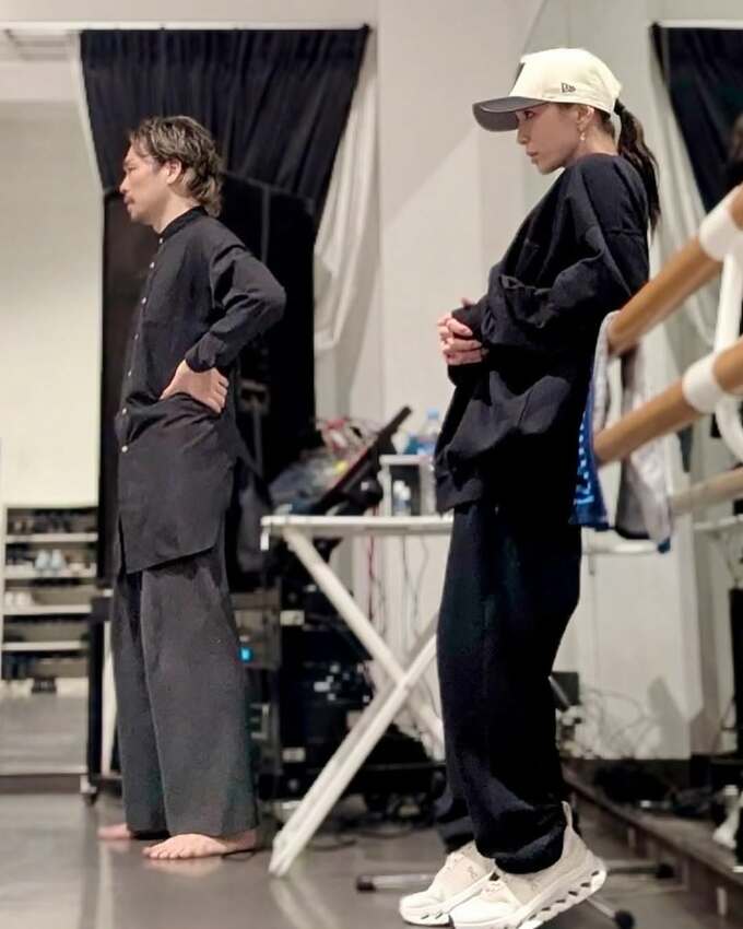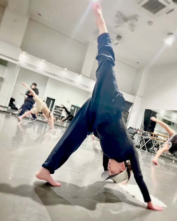 浜崎さんは、ダンススタジオの大きなミラーの前でダンサー達を見渡しているワンショット写真や、ダンサー達とともにフロア上でストレッチやトレーニングに励む写真を投稿。完全に開脚して上体をフロアに密着させたり、ダウンドッグの姿勢から右足を完全に天に向けて伸ばし上げるなど、並ならぬ身体能力を披露しています。