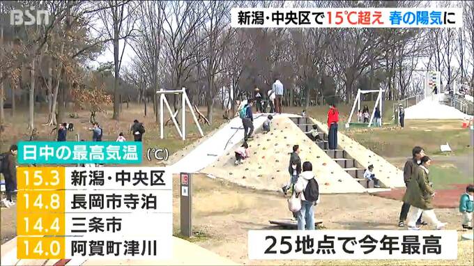 最高気温は新潟市中央区で15.3℃、長岡市寺泊で14.8℃、三条市で14.4℃など、県内28の観測地点のうち25地点で今年最高を観測し、4月中旬並みの暖かさとなったところもありました。